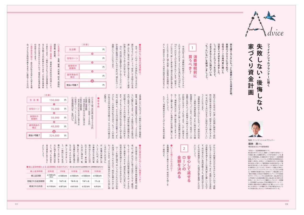 すみたく本(2014.03) 2015/05/17| Magazine 弊社代表の舘林が、すみたく本(2014年3月号)の「ファイナンシャルプランナーに聞く、失敗しない・後悔しない 家づくり資金計画」を寄稿いたしました。