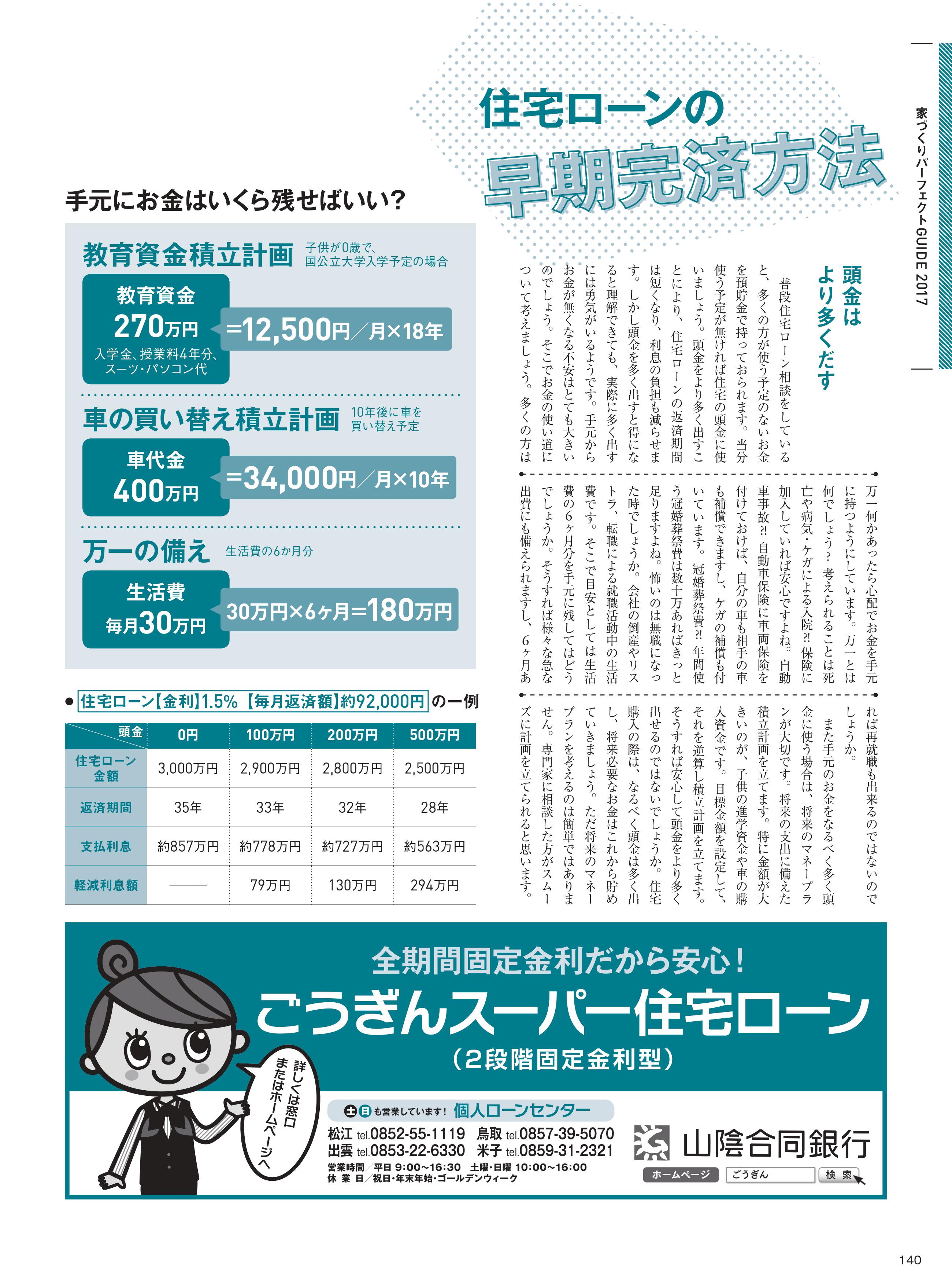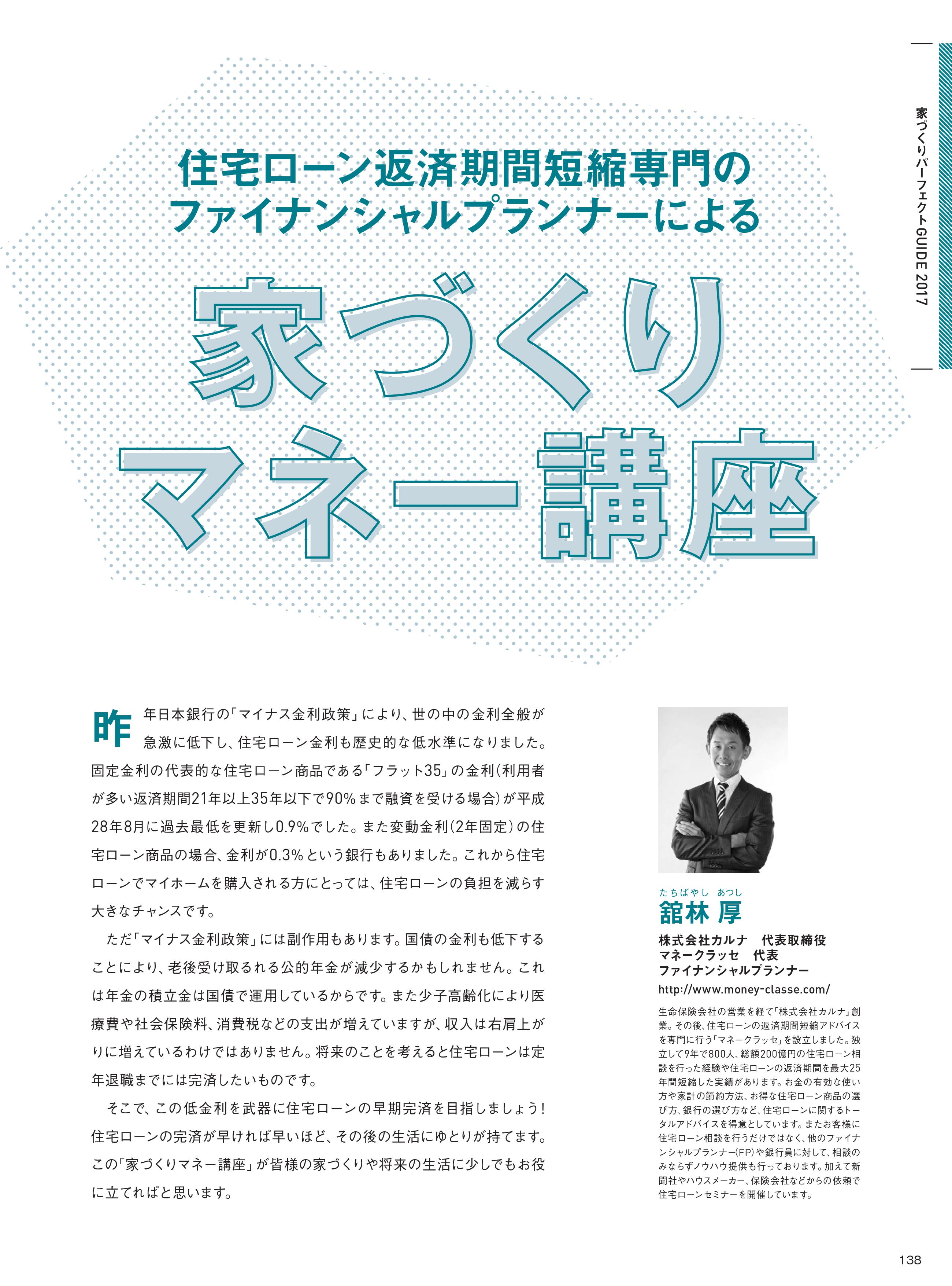 とっとり・しまねの家づくり(2017) 2017/08/16| Magazine 弊社代表の舘林が、鳥取県と島根県の住宅雑誌「とっとり・しまねの家づくり2017」の家づくりマネー講座を担当させていただきました。これから住宅ローンで新築を検討されている方はぜひ参考にしてください。