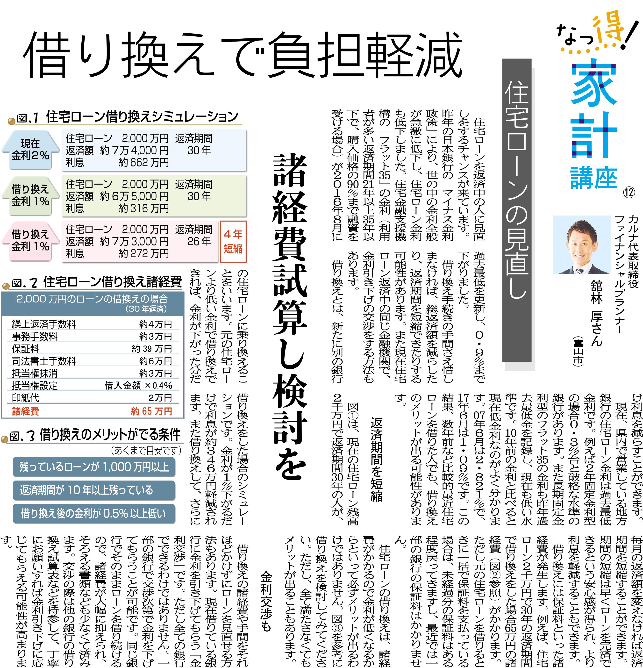 北日本新聞朝刊(2017.7.8) 2017/07/12| Magazine 北日本新聞朝刊(2017年7月8日)に掲載 2016年8月から北日本新聞で、お金に関する様々な情報をお伝えする「なっ得家計講座」の連載です。期間は1年で毎月第2土曜日に掲載されます。FP舘林は奇数月を担当し、今回は6回目の最後の掲載で「住宅ローン」についてです。日本銀行のマイナス金利政策の影響で、住宅ローンの金利は去年から引き続き低いです。住宅ローンを返済中の方には見直しのチャンスかもしれません。 下記のサイトからもご覧になれます! 北日本新聞ウェブ(webun ウェブン) マイベストプロ富山